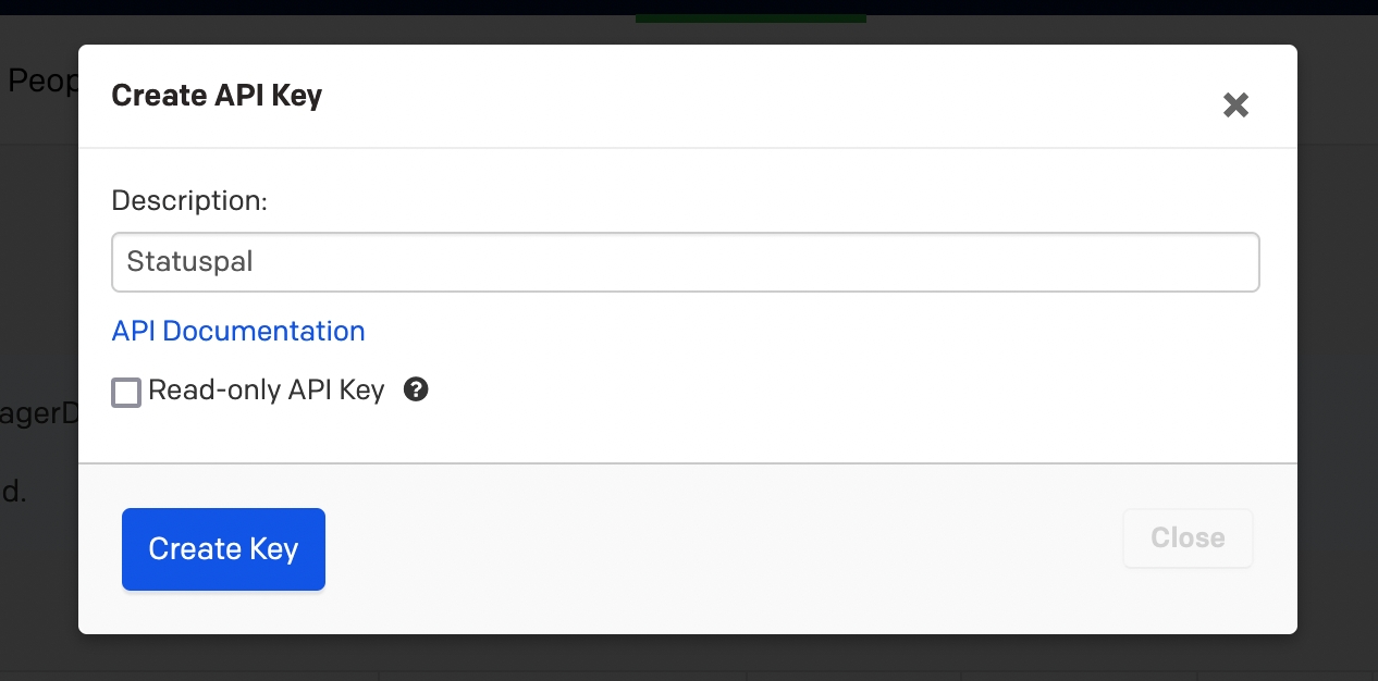 In the modal form enter Statuspal as the description, and make sure to uncheck "Read-only API Key" (we need write access to PagerDuty in order to create webhooks with their API).