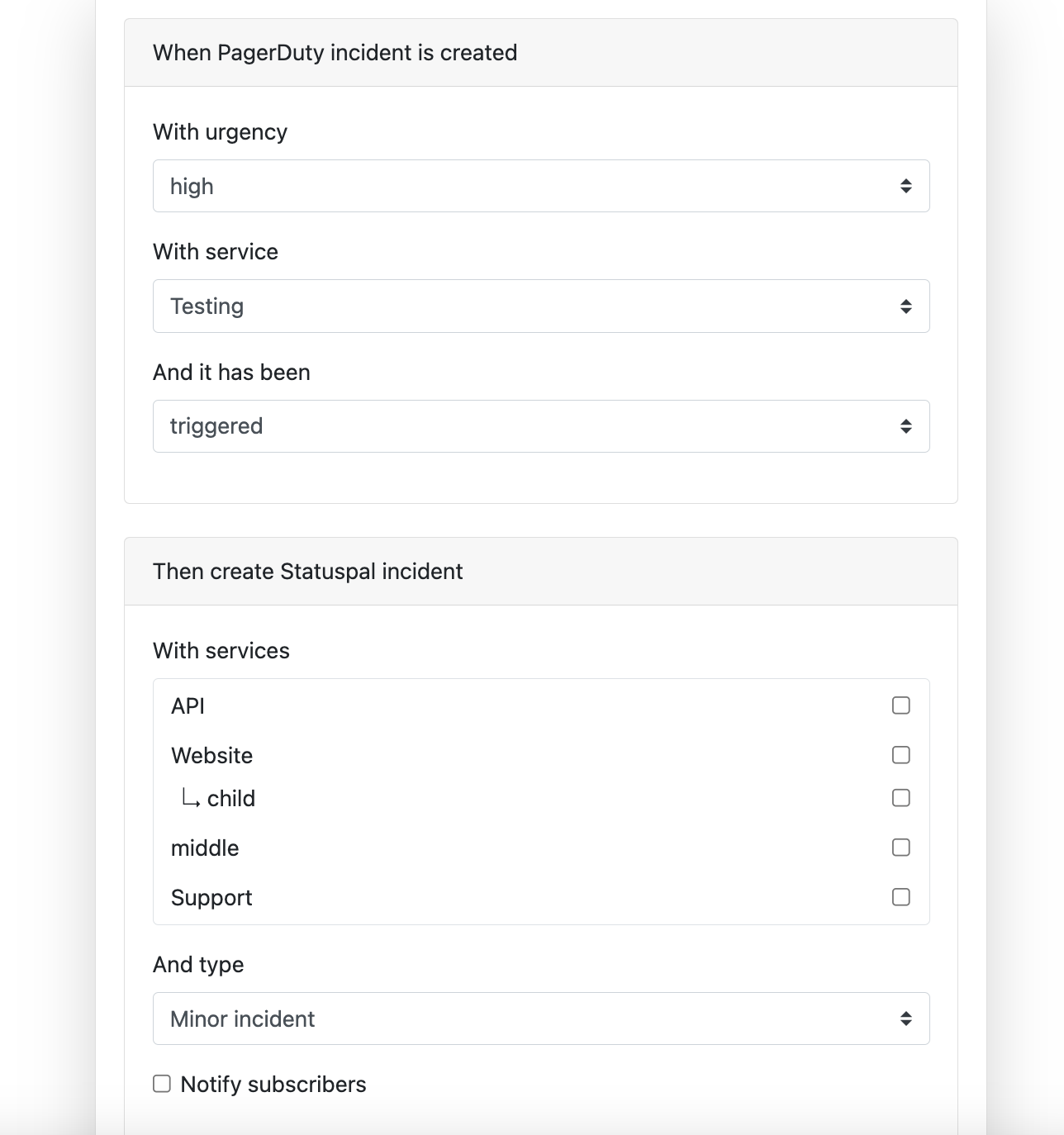 In order to automate Statuspal incident creation and resolution from PagerDuty you need to configure what services and severity of PagerDuty incidents should be monitored and what services and severity should the corresponding Statuspal incident be created with.