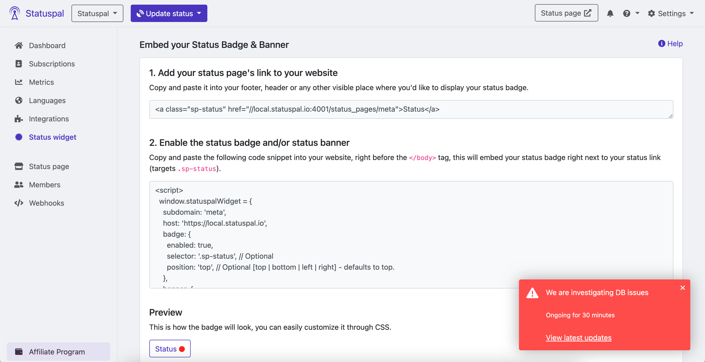 Embed your status page's reported status in your website or help portal as a badge and/or banner.