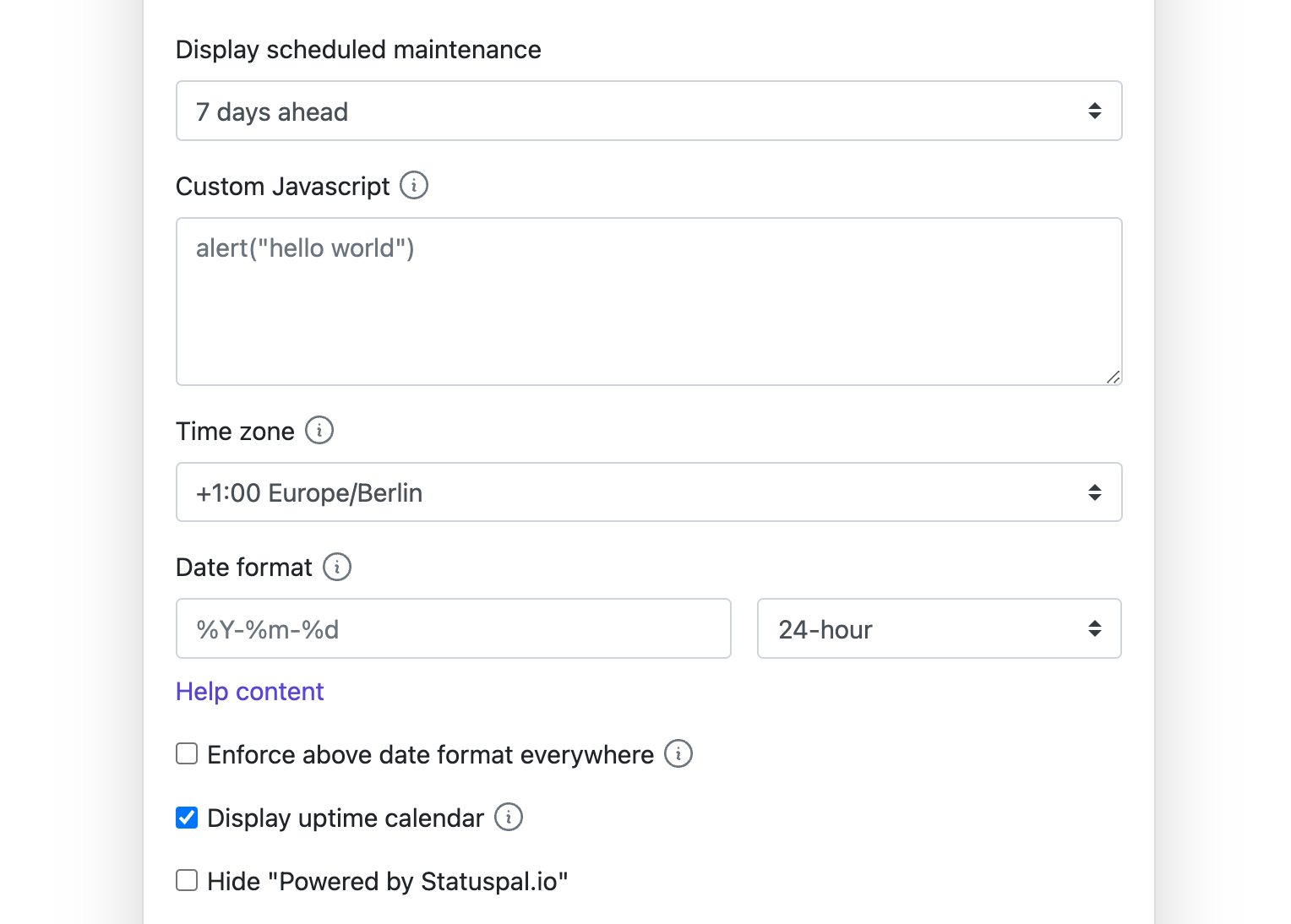Visit [advanced-settings](https://docs.statuspal.io/platform/status-page-settings-and-design/advanced-settings "mention") to learn about your status page's advanced settings.