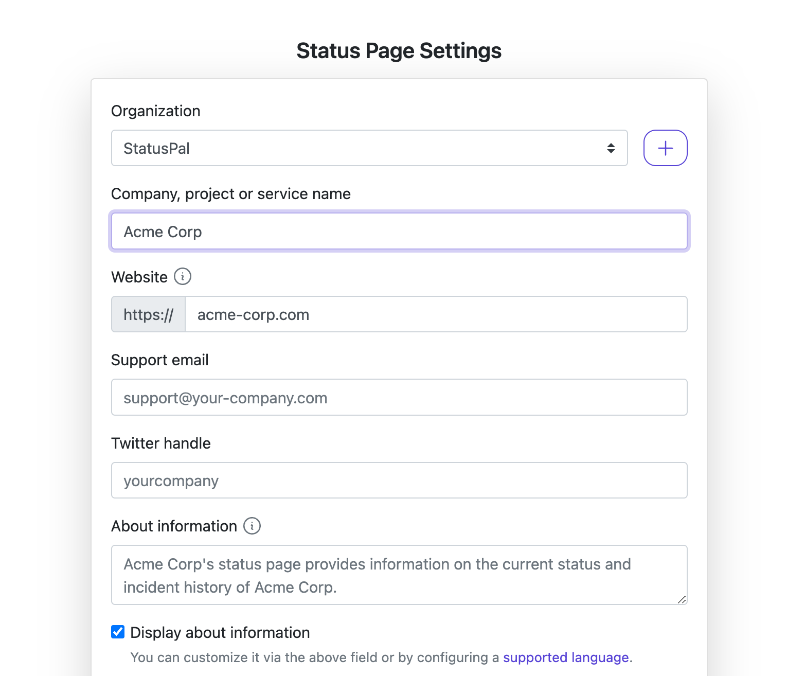 * **About information** is displayed in your status page and meta description explaining to your visitors about what's the purpose of your status page.