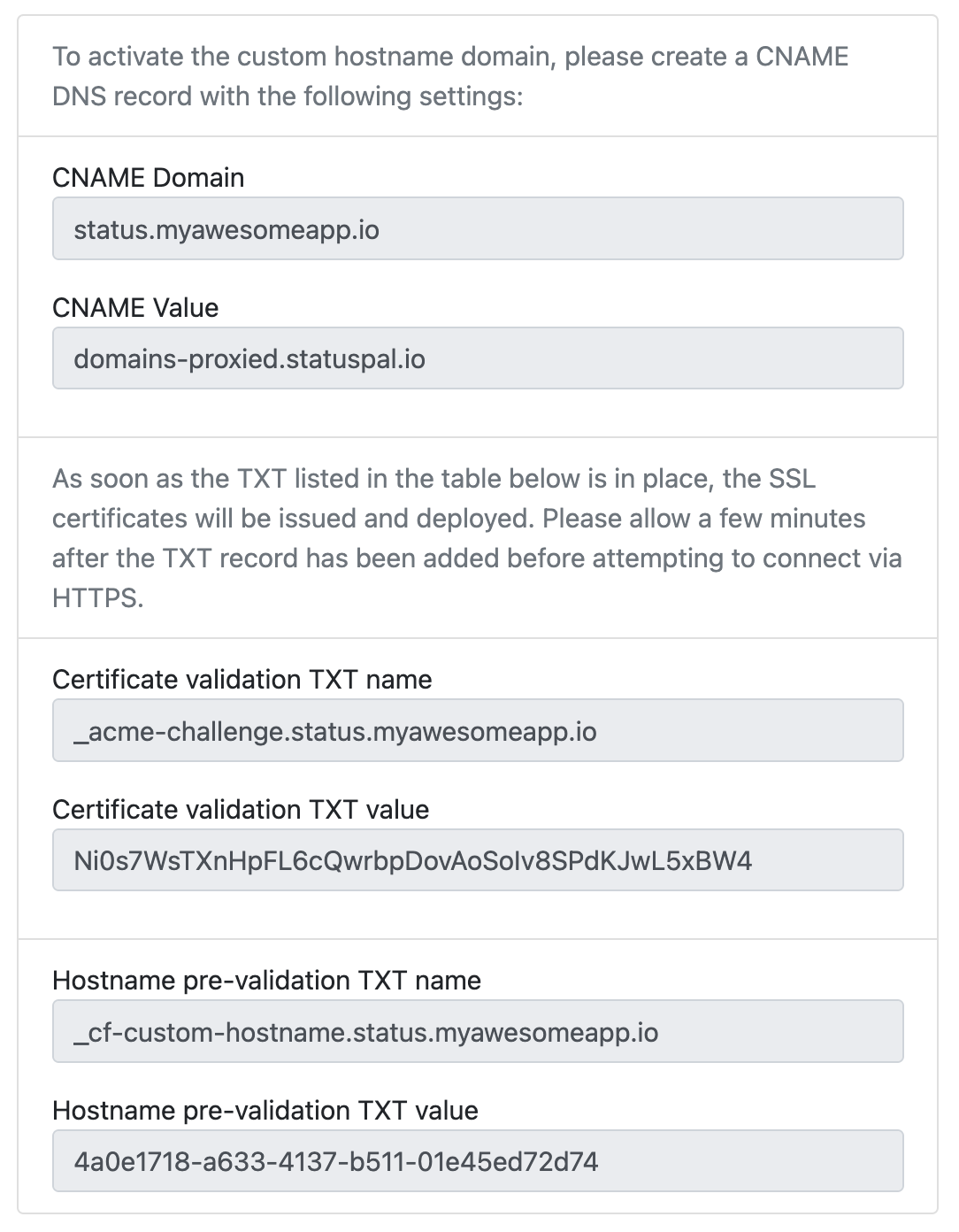 Keep in mind that the required DNS records vary depending on whether you're using `statuspal.io` or `statuspal.eu`.