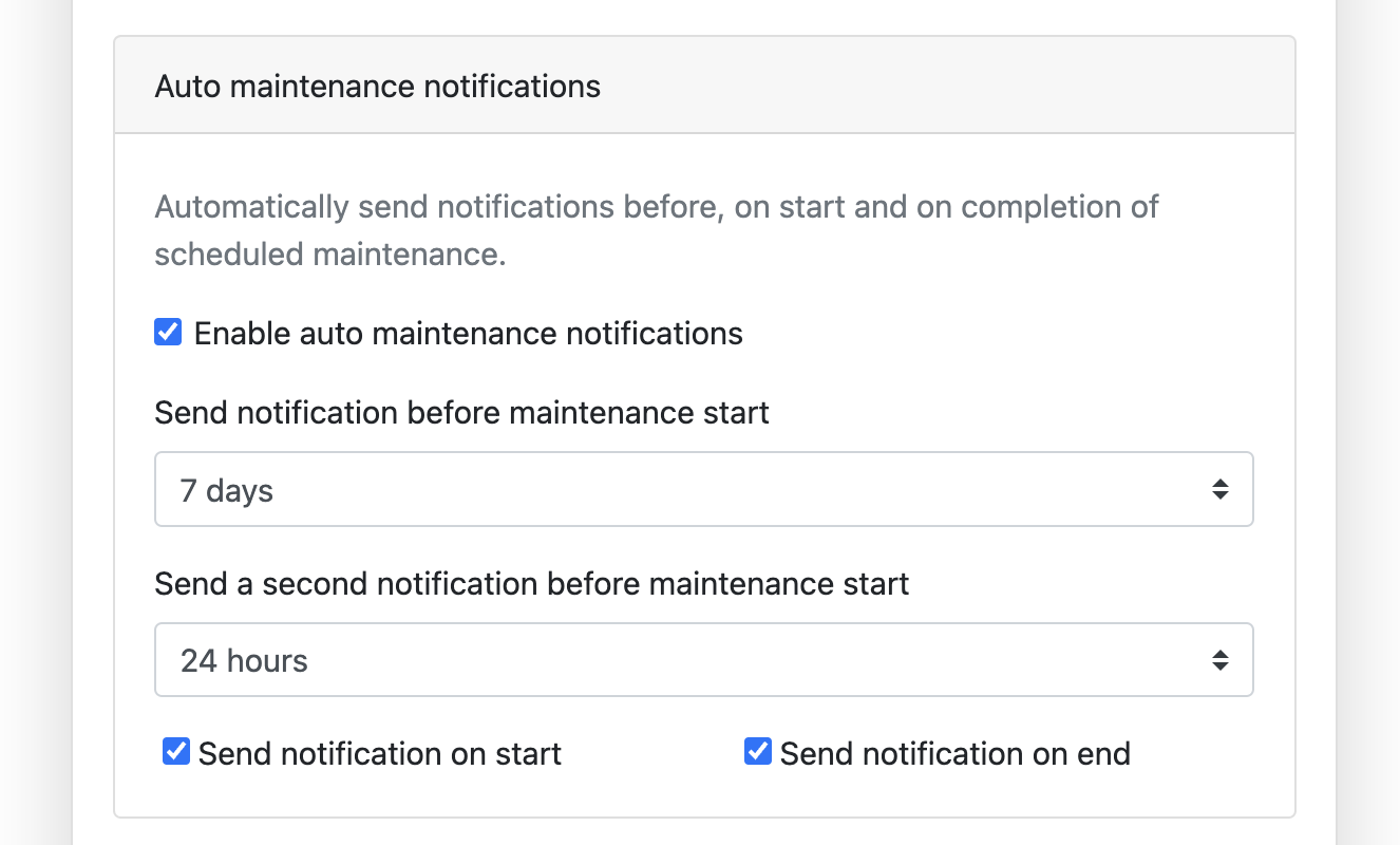You can also opt to send automatic notifications on the start and end of the scheduled maintenance.